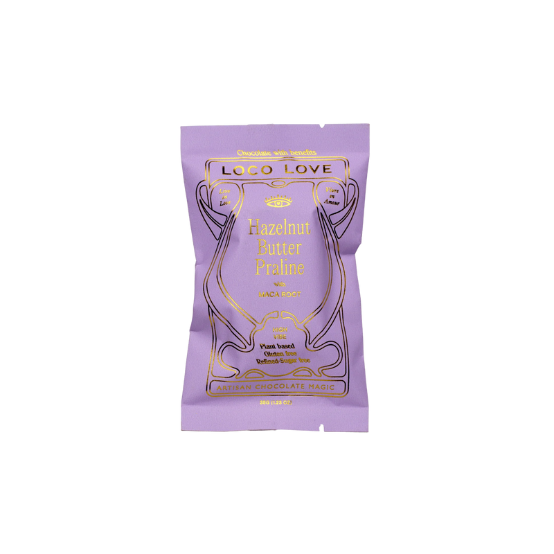 A smooth and freshly ground hazelnut butter center, with a few crunchy surprises. Spiked with Peruvian ginseng aka maca powder, which is known for its adaptogenic qualities and increasing libido. Think Ferrero Rocher without the harmful sugars. Ceremoniously inhale the nutty, cacao-drenched aroma for a sensorial delight.