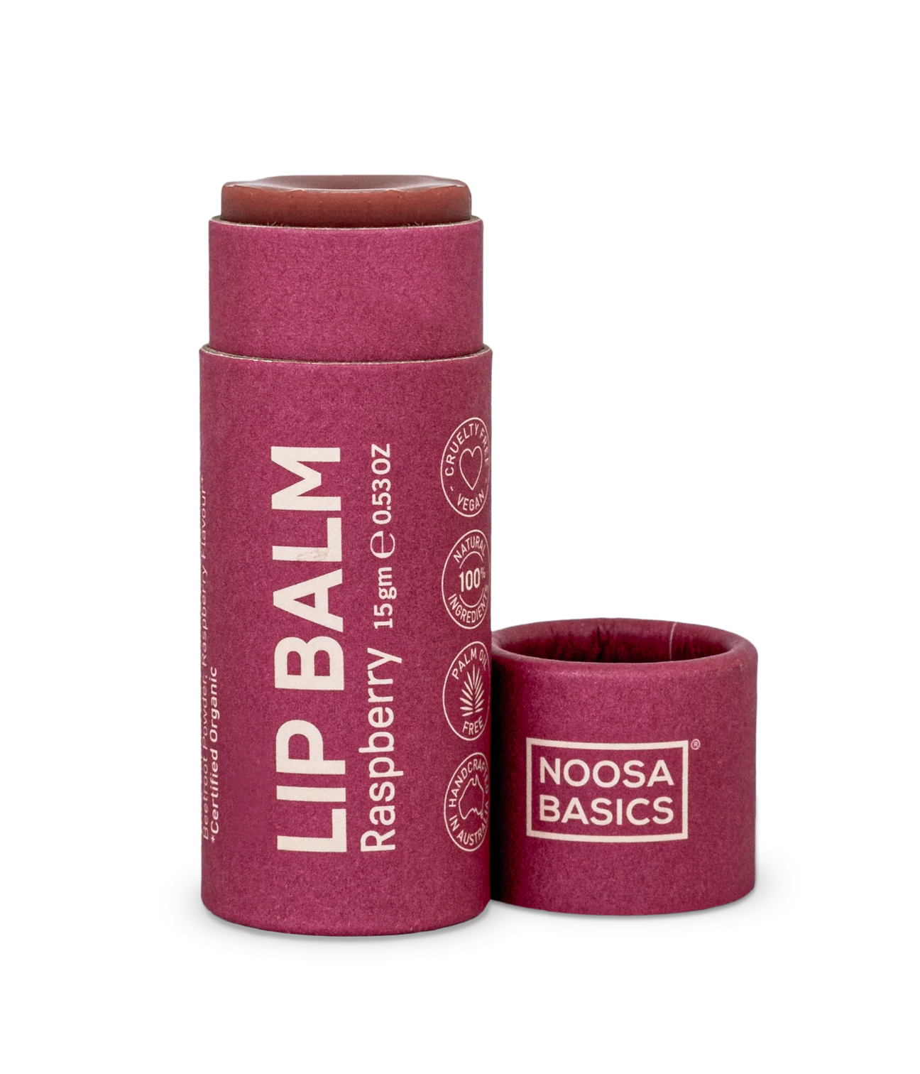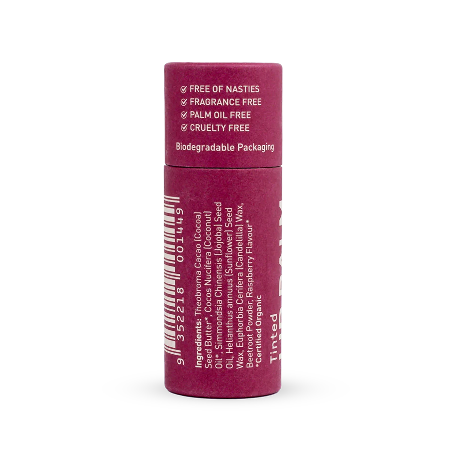 Theobroma Cacao (Cocoa) Seed Butter*, Cocos Nucifera (Coconut) Oil*, Simmondsia Chinensis (Jojoba) Seed Oil, Helianthus annuus (Sunflower) Seed Wax, Euphorbia Cerifera (Candelilla) Wax, Alkanet Root Powder, Raspberry Flavour*. *Certified Organic