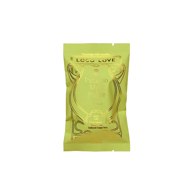 A silky pistachio ganache, dotted with lightly caramelised pistachio pieces. A balance of creamy and crunchy. Sweetened with mineral-rich natural sweeteners and enrobed in our signature mylk chocolate, spiked with beauty mushroom tremella.