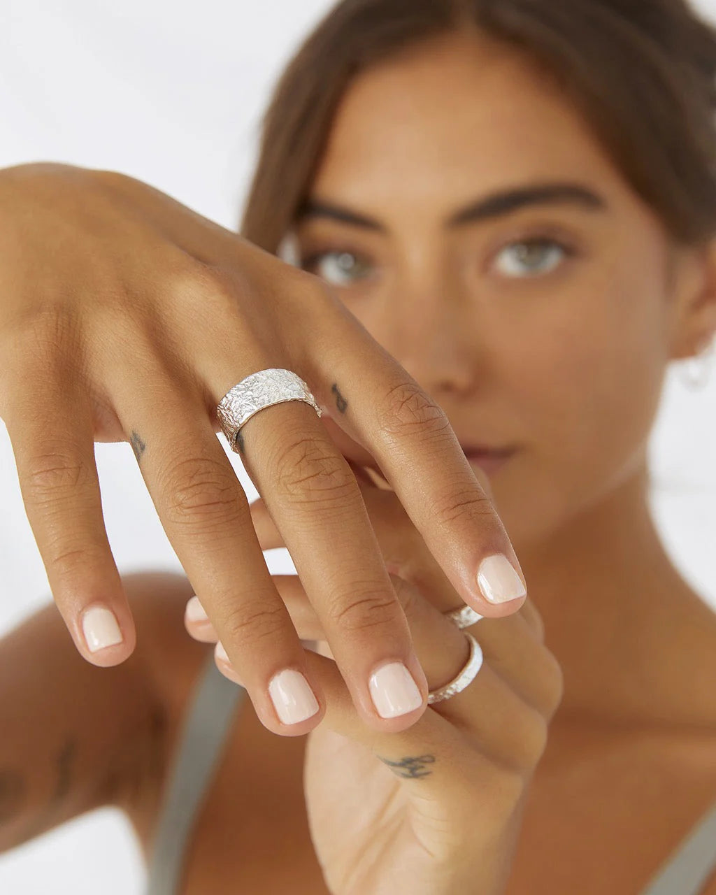 The Large Eros Textured Ring is made to make a statement. With its bold, wide band and signature shimmering texture, this standout piece brings elevated edge and shine to any look, whether worn solo or stacked with your favourites.